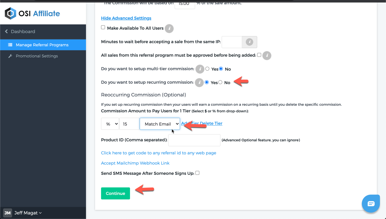 Step 3. Enable recurring commission, select commission type, add amount or percentage, select Match Email, and click Continue. And on the next page, click Finish.